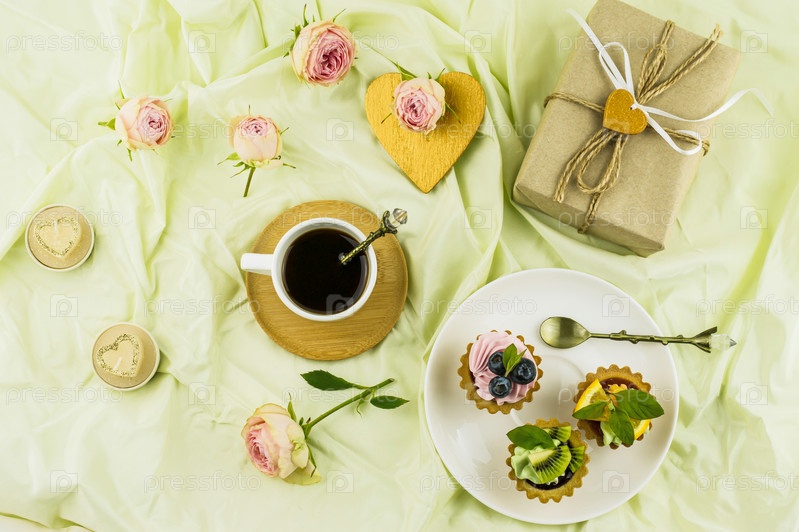 Вид сверху на романтическую композицию на пастельном шелковом фоне. бутоны роз, чашка кофе, коробка с подарком, тарталетки со сливками и фруктами
