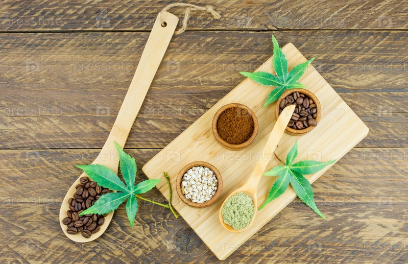 Вид сверху на ассортимент кофе в мини-мисках и деревянных ложках с семенами и листьями коннабиса. деревянный коричневый фон