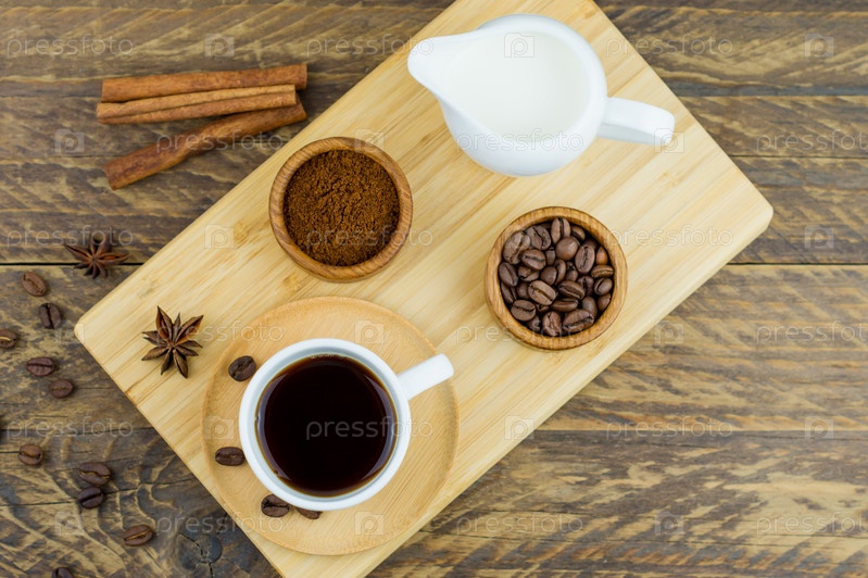 Чашка ароматного кофе на деревянном подносе с молочником, палочками корицы, кофейными зернами. кофейная композиция. вид сверху