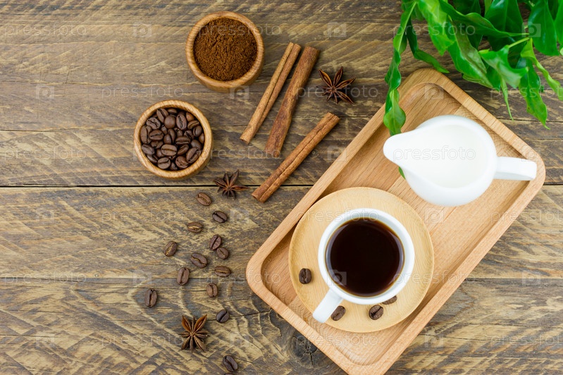 Вид сверху на деревянный поднос с чашкой горячего кофе и молочником с молоком для улучшения вкуса. коричневый деревянный стол с листьями кофе арабика