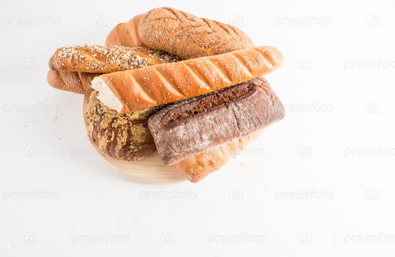 Свежий, хрустящий хлеб различной формы и вкуса на деревянной доске и белом фоне. копия места для вашего текста