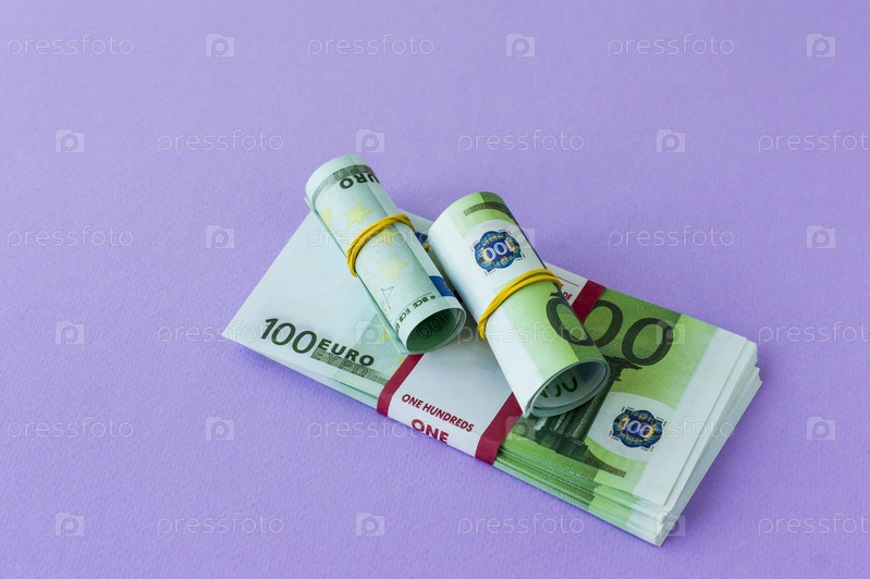 Пачка банкнот 100 евро в банковской упаковке и два рулона под резинкой на ней. сиреневый фон