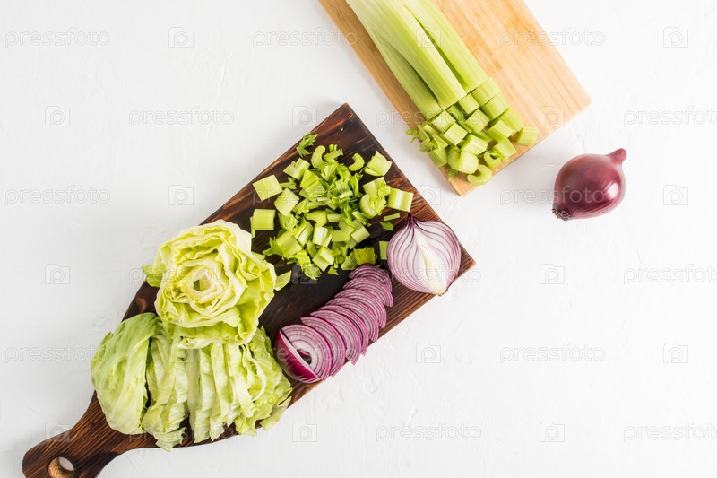 Вид сверху на две деревянные кухонные доски с нарезанными на них овощами для салата. концепция здорового питания, витамины. белый фон