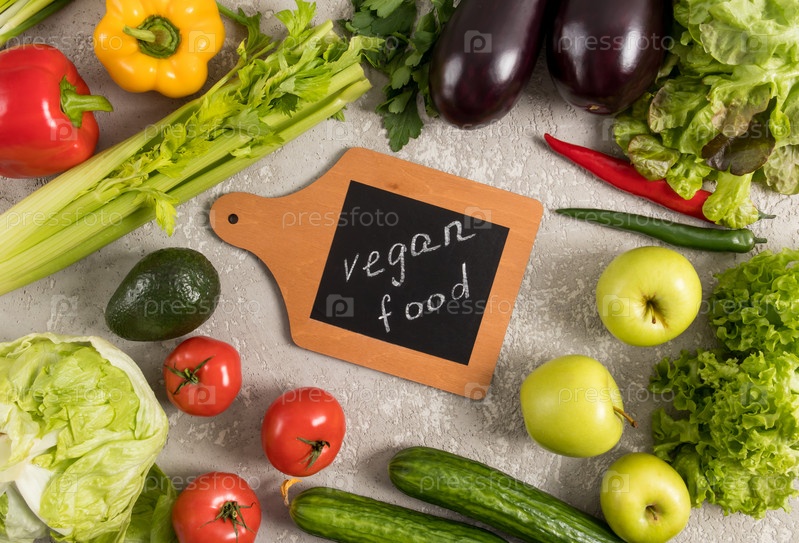 Рамка из органических продуктов на сером фоне в центре с кухонной доской - веганская еда. концепция здорового питания