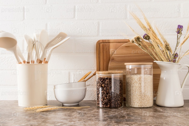 Набор кухонной утвари на столешнице из темного мрамора на фоне белой кирпичной стены. фон интерьера кухни
