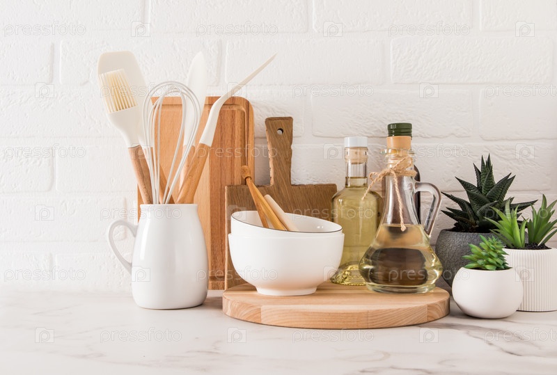 Различные виды кухонной утвари и бутылки с маслом на мраморной столешнице напротив стены из белого кирпича. концепция домашнего декора кухни