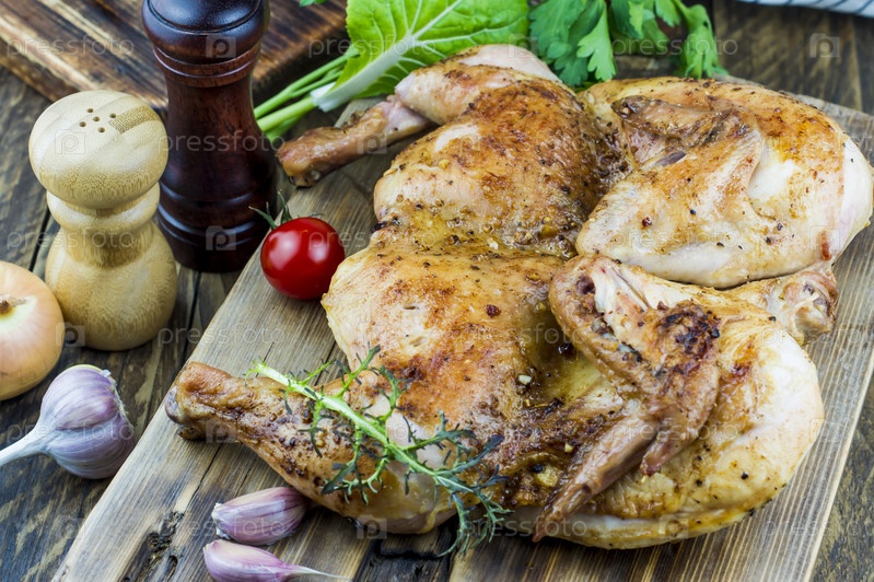 Сочное мясо птицы, табачный цыпленок на разделочной доске. помидоры, чеснок, шпинат, лук для улучшения вкуса блюда