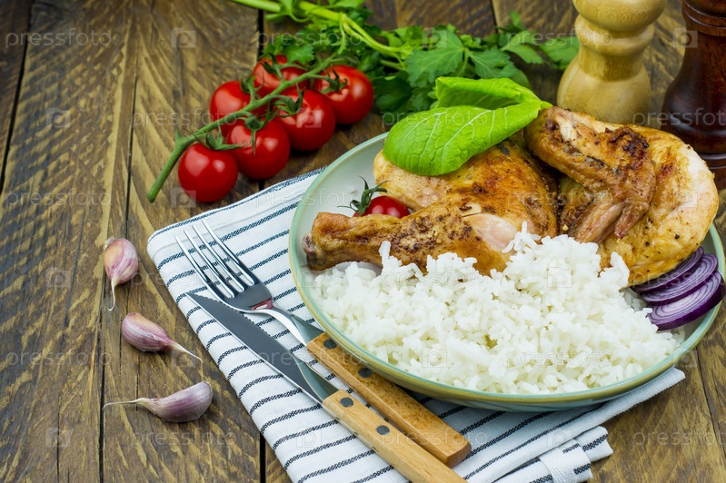 Тарелка табака, белого риса, петрушки и салата на деревянном деревенском столе. ветка с помидорами, специями. деревенский стиль