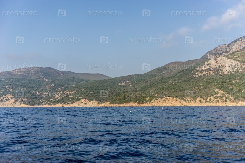 Береговая линия с холмами, покрытыми растительностью, на фоне голубого моря и неба с облаками