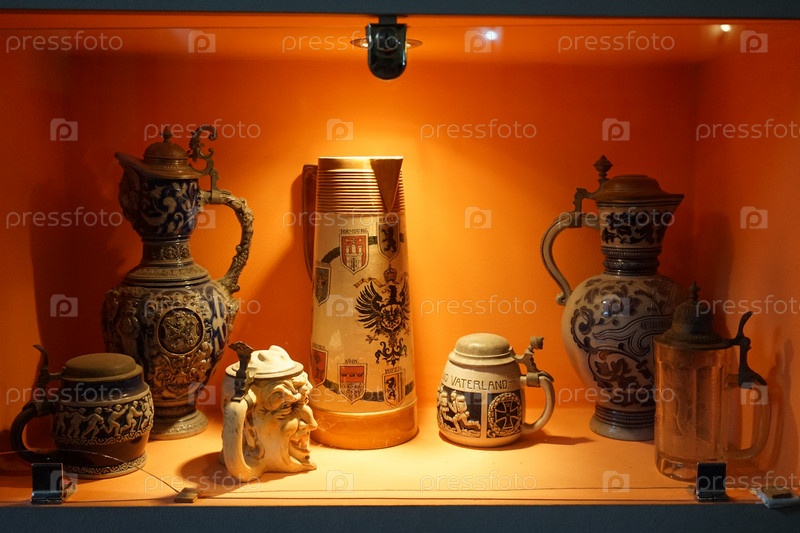 Винтажные пивные кружки в витрине музея