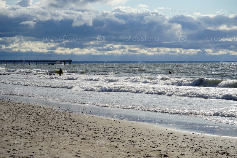 Морской пейзаж с серферами в волнах