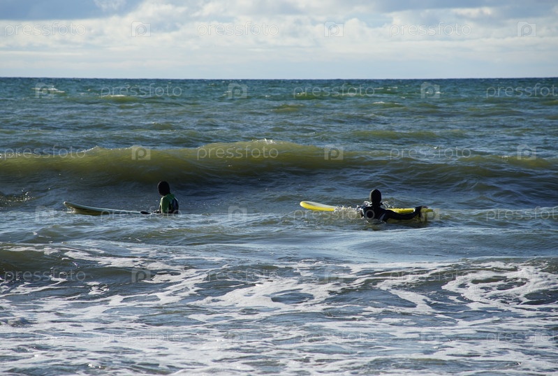 Морской пейзаж с серферами в волнах
