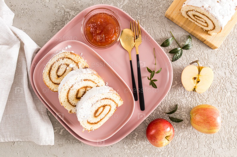Три кусочка домашнего бисквита с яблочным рулетом подаются на розовой керамической тарелке и подносе. закуска десерт, закуска. вид сверху. серый фон