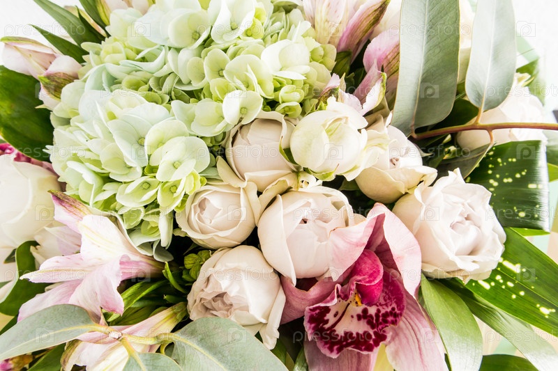 Праздничный цветочный фон. красивые бутоны белых роз, гортензии, весенние цветы. крупный план