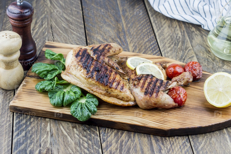 Деревянная кухонная доска с жареной курицей и зеленью шпината. сочный лимон, специи для улучшения вкуса на деревянном столе