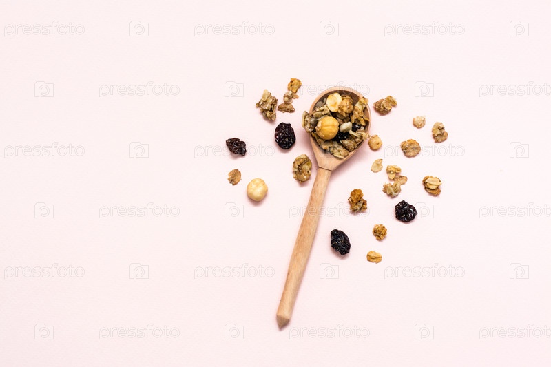 Здоровое питание. Запеченная мюсли из овса, орехов и изюма в деревянной ложке на розовом фоне. Вид сверху