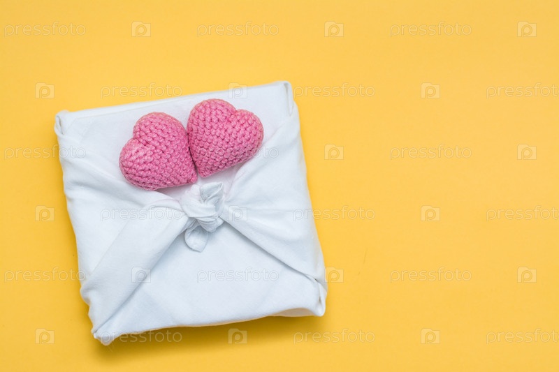День святого Валентина без отходов. Экологичный подарок фурошики и вязаные сердечки на желтом фоне. Скопируйте пространство. Вид сверху