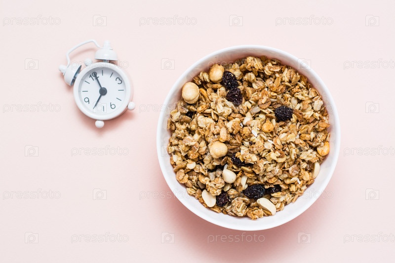 Здоровое питание. Запеченная мюсли из овса, орехов и изюма в миске и будильник на розовом фоне. Вид сверху
