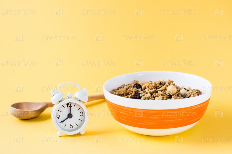 Здоровое питание. Запеченный овес, орехи и изюм гранола в миске, деревянная ложка и будильник на желтом фоне