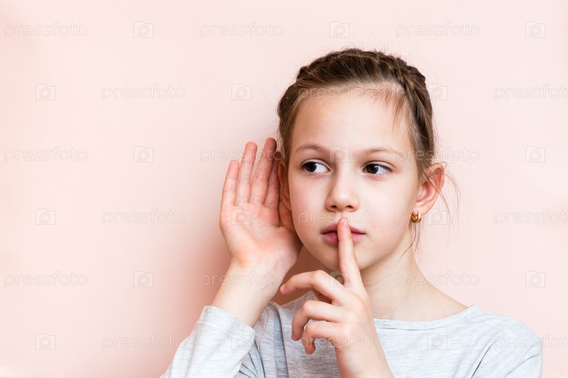 Грустная девушка держит палец перед губами и руку возле уха слушает. Призыв к тишине