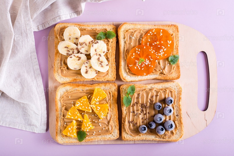 Тост с арахисовым маслом, фруктами, ягодами, семенами льна и кунжутом на разделочной доске. Вид сверху