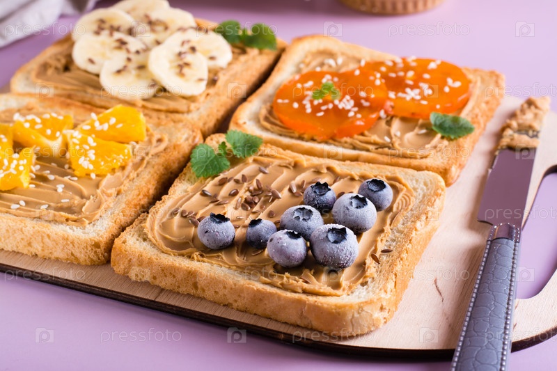 Тост с арахисовым маслом, фруктами, ягодами, семенами льна и кунжутом на разделочной доске