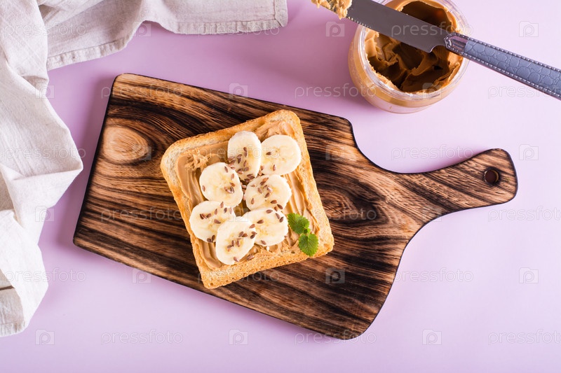 Тост из арахисового масла с бананом, семенами льна и мятой на разделочной доске. Вид сверху
