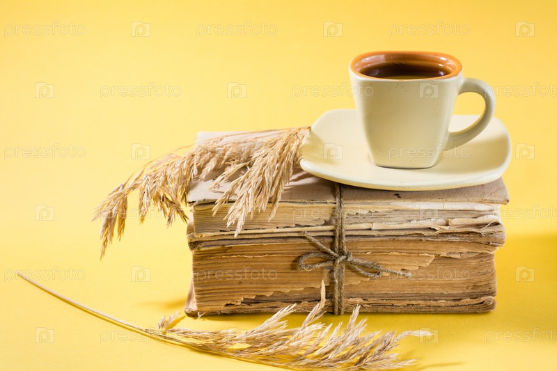 Чашка кофе на старых книгах и сухих кукурузных початках желтого цвета. Оздоровление, гармония, спокойное чтение