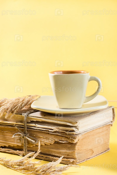 Чашка кофе на старых книгах и сухих кукурузных початках желтого цвета. Оздоровление, гармония, спокойное чтение. Скопируйте пространство, вертикальный вид