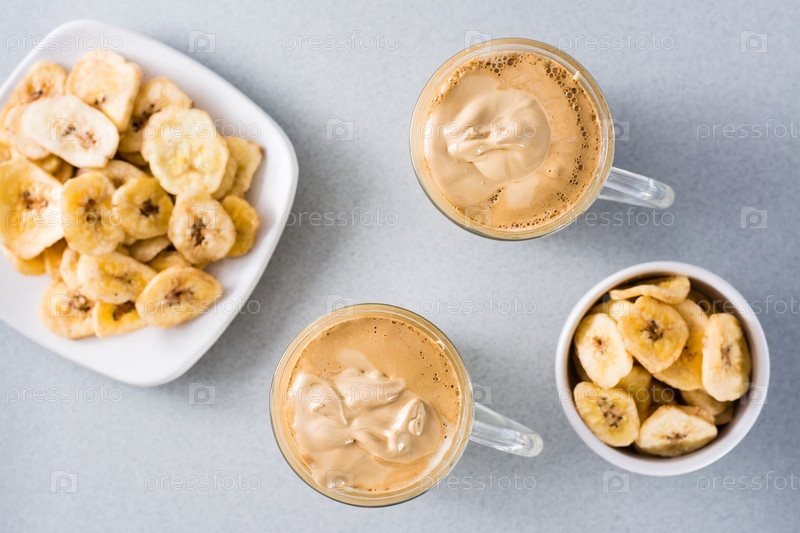 Карантинная кухня. Две чашки с кофе далгона и банановыми чипсами на сером фоне. Вид сверху