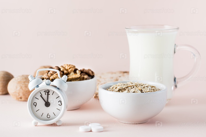 Хороший сон. Продукты для хорошего сна - молоко, грецкие орехи, овсянка, снотворное и будильник на розовом фоне
