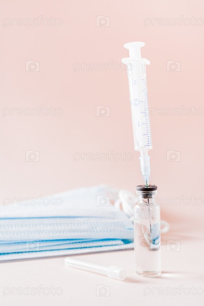 Вакцинация и иммунизация. Игла шприца вставлена в стеклянный флакон с вакциной и лицевую маску. Вертикальный вид