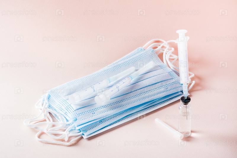 Вакцинация и иммунизация. Шприцы лежат на масках для лица, а один шприц вставлен в стеклянный флакон с вакциной