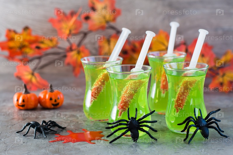 Коктейли на Хэллоуин. Шприцы с кровью в стаканах с зеленым лимонадом и пауки на столе
