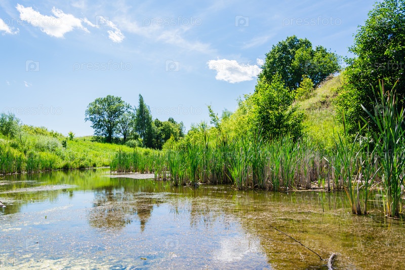 Спокойный пруд с тростником, окруженный лугами и деревьями в летний солнечный день. Медленная деревенская жизнь