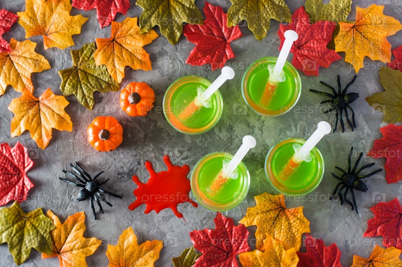 Коктейли на Хэллоуин. Шприцы с кровью в стаканах с зеленым лимонадом на столе. Праздничные украшения. Вид сверху