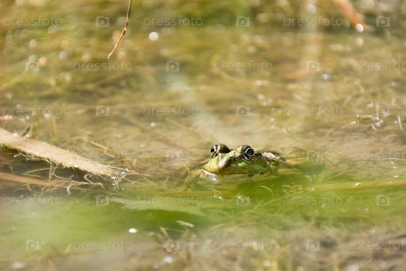Голова лягушки с большими глазами торчит из спокойного пруда с водорослями. Меланхолическая животная жизнь