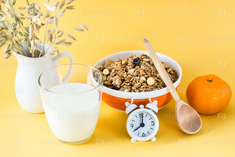 Здоровый сытный завтрак. Запеченная мюсли в миске, стакан молока, апельсин, деревянная ложка и будильник на желтом фоне