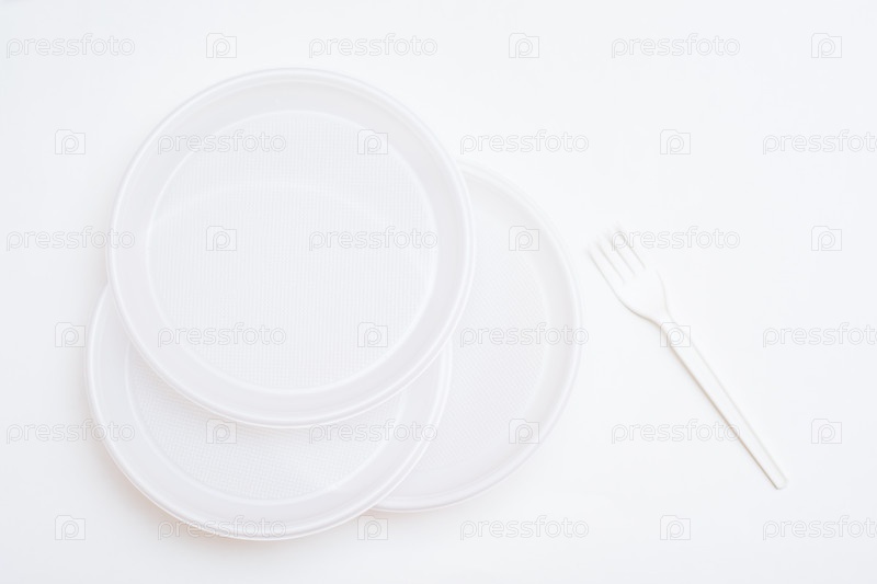 Три белые одноразовые чистые пластиковые тарелки и вилка на белом фоне. Вид сверху