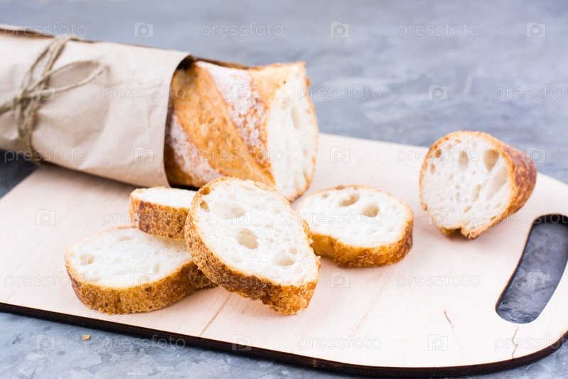 Свежий багет в оберточной бумаге, нарезанный кусочками на разделочной доске на столе