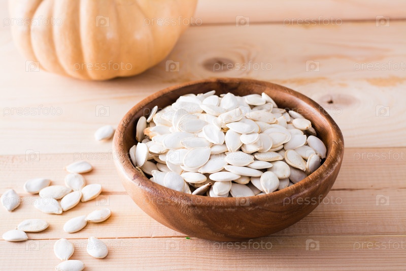 Жареные тыквенные семечки в тарелке и тыква на деревянном столе