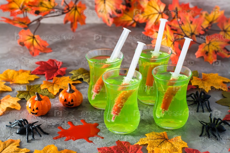Коктейли на Хэллоуин. Шприцы с кровью в стаканах с зеленым лимонадом, пауки и капля крови на столе