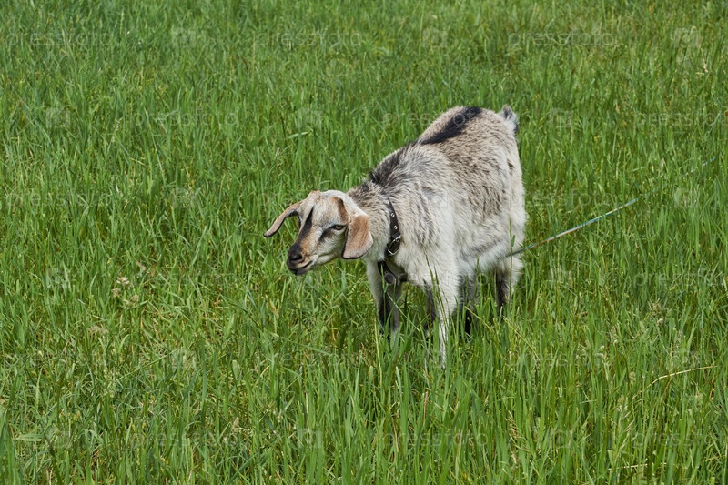 Лето. Коза пасется на лугу в теплый летний день