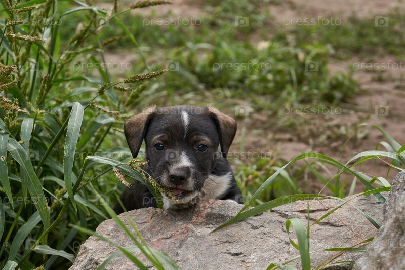 Щенок гуляет во дворе дома и греется в лучах осеннего солнца
