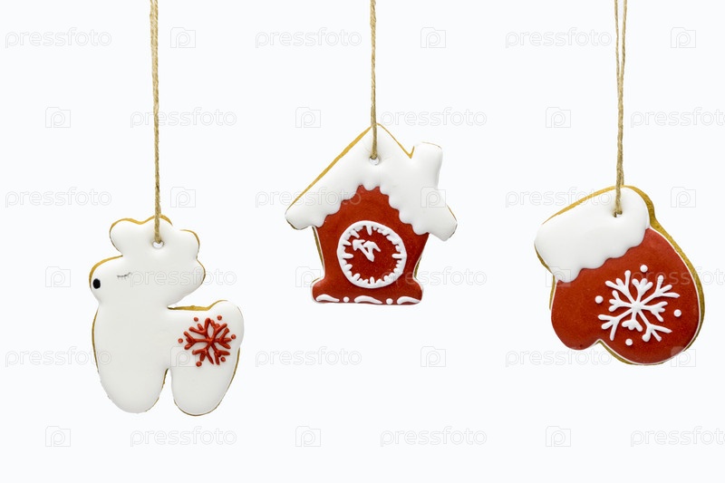 Елочные игрушки из имбирных пряников весят изолированно
