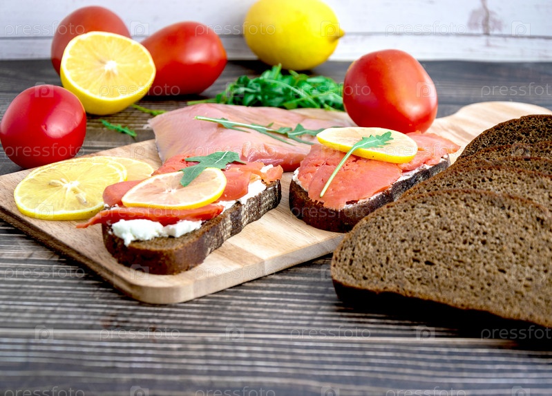 Открытые бутерброды с красной рыбой на деревянной доске. Съемка крупным планом