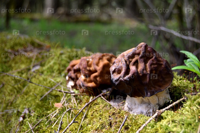 Грибы сморчка в зеленой траве, первые весенние грибы
