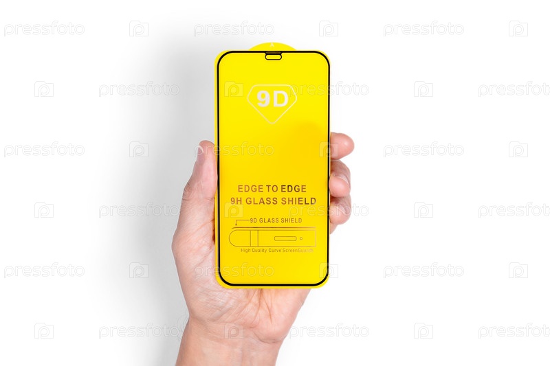 Рука держит защитный экран для мобильного телефона. Белый фон. Крупный план
