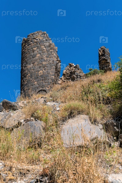Армения, Амберд, сентябрь 2022 г. Горный склон с камнями и полуразрушенной башней