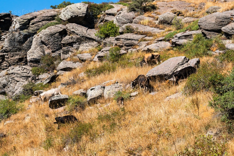 Стадо домашних коров среди скал в кавказских горах
